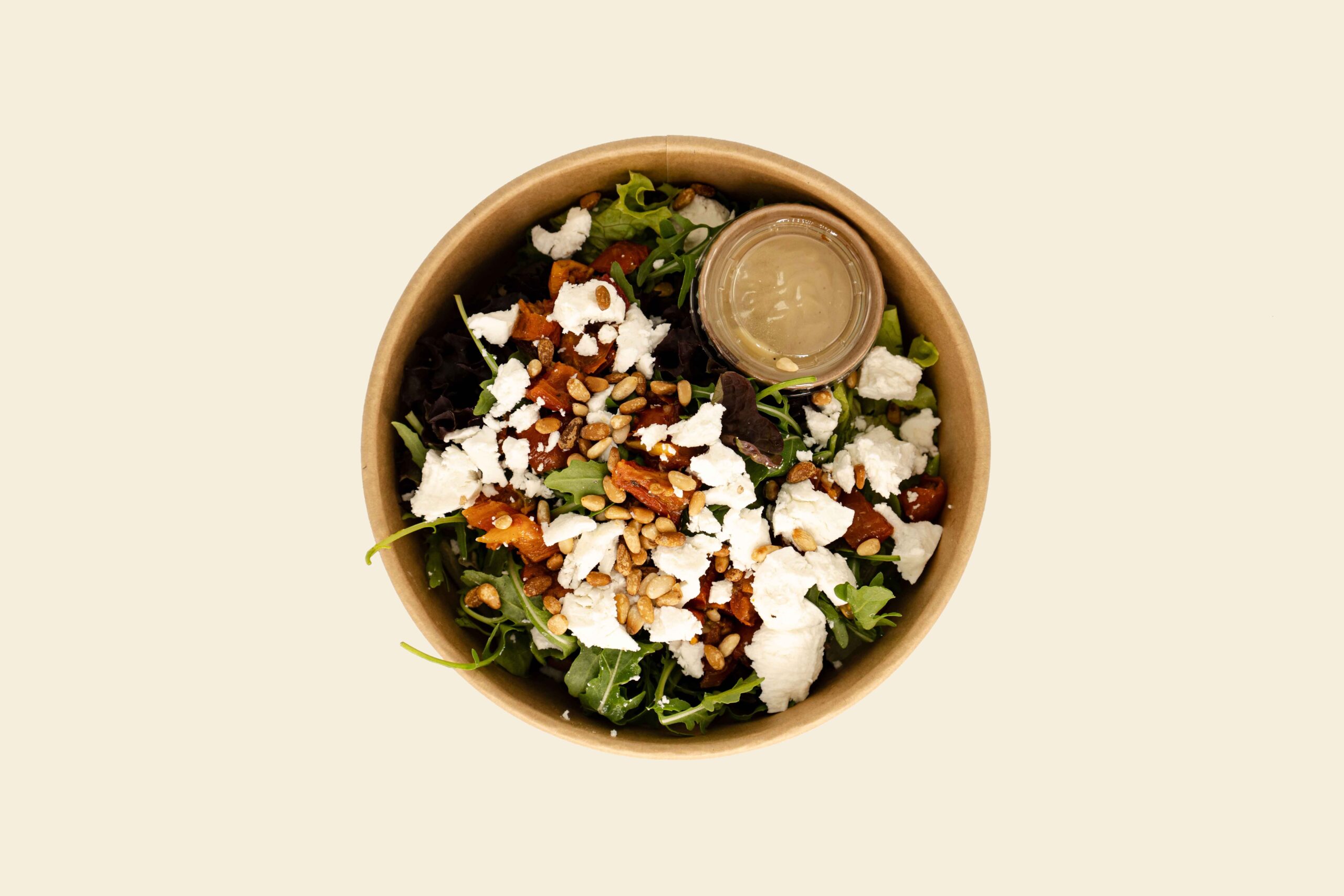 Mixed salad, arugula, grilled pine nuts, crumbled fresh goat cheese and dried tomatoes. Balsamic vinaigrette.
