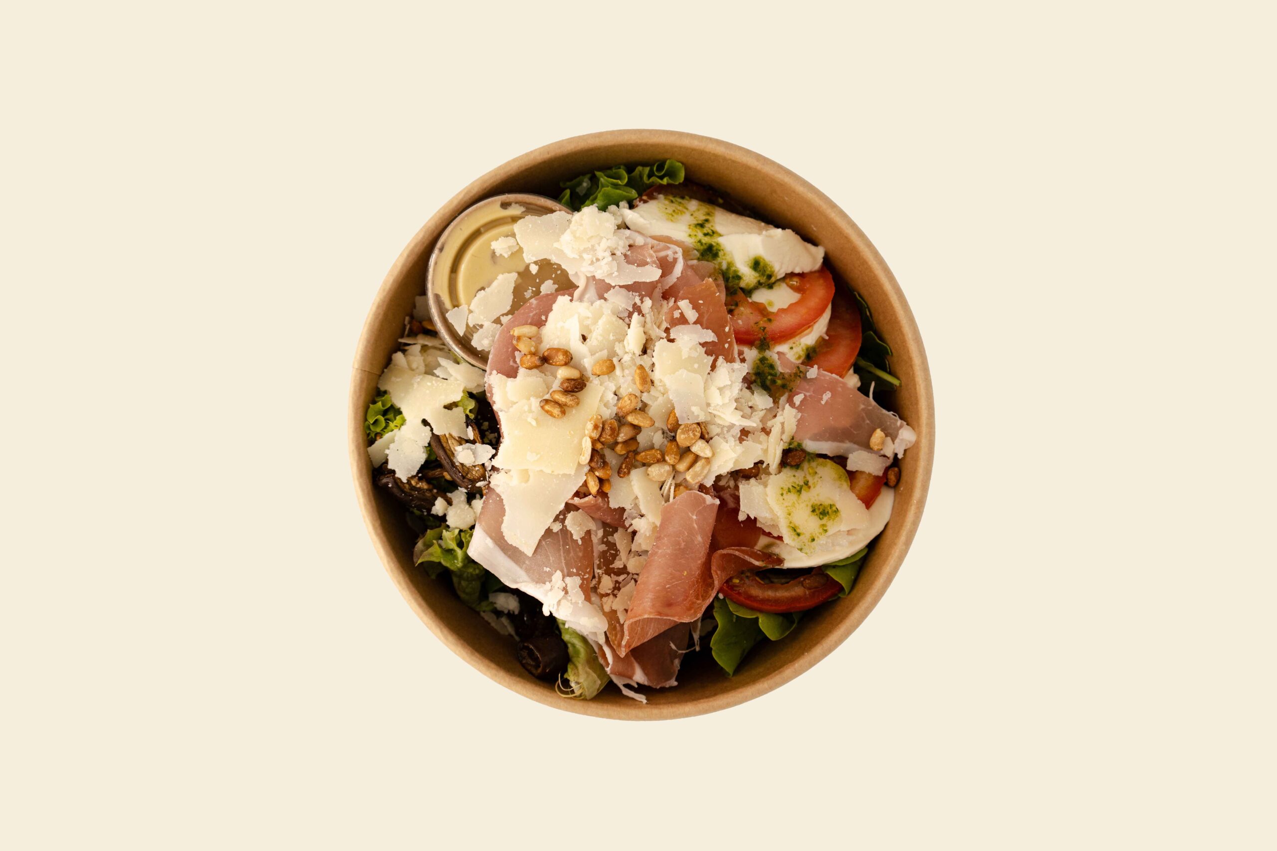 Parma ham, mozzarella, grilled eggplant, pine nuts, tomatoes, arugula, parmesan shavings served with our home made vinaigrette
