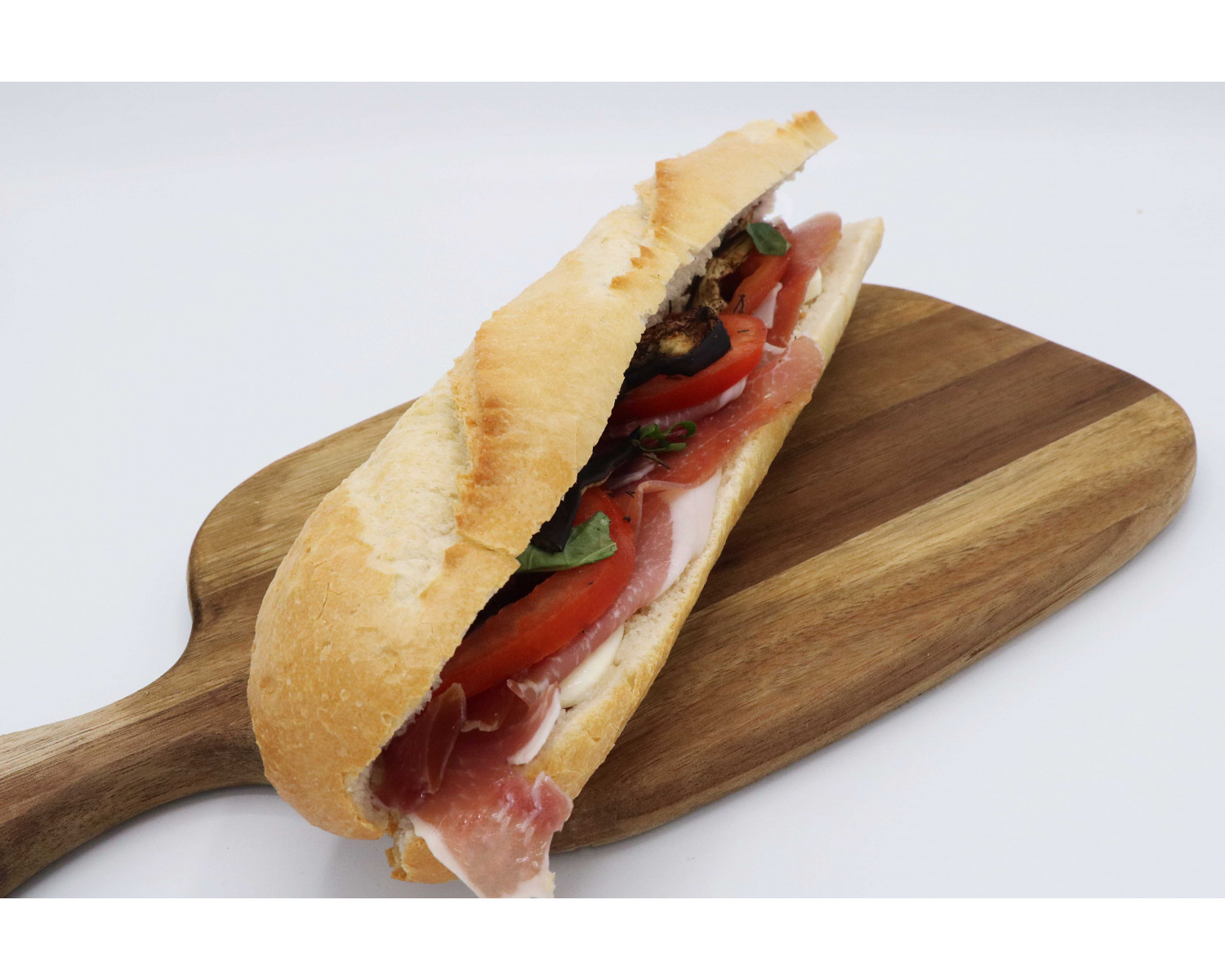 Parma ham, mozzarella, tomato, grilled eggplant, fresh basil and olive oil with green pesto. (New recipe)