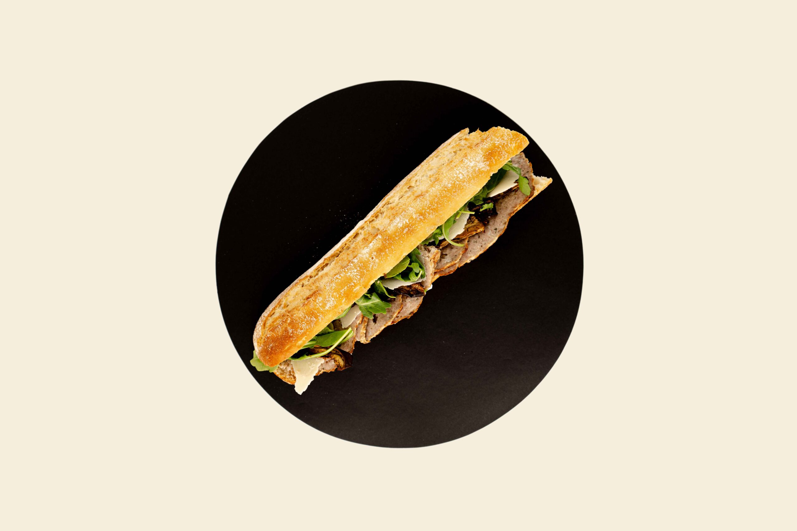 Meatloaf, pepper sauce, parmesan, grilled eggplant and arugula.