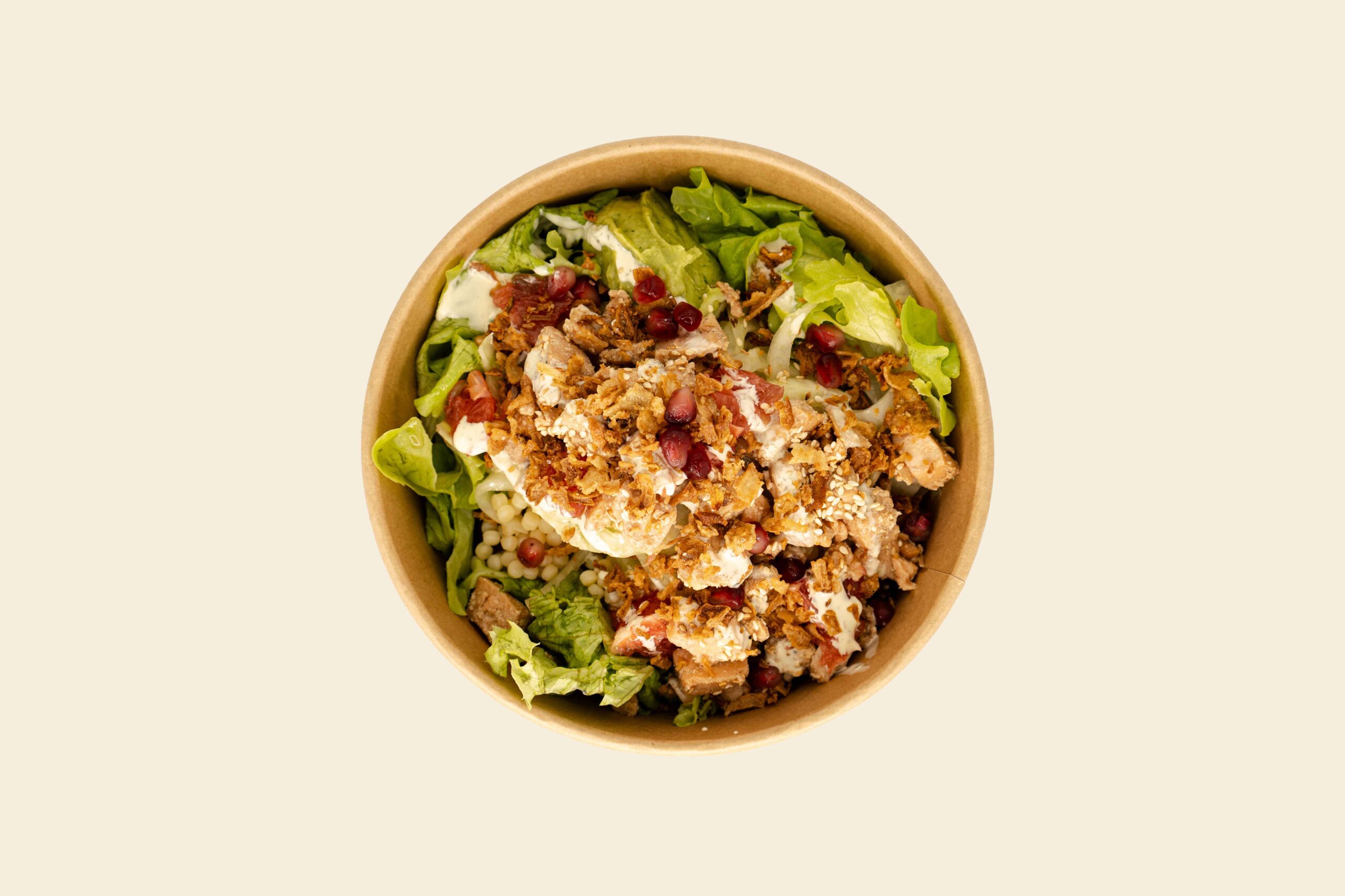 Salmon marinated in soy and sesame seeds, avocado coriander sauce, tangy fennel carpaccio, couscous pearl, grapefruit cubes, fried onions on a bed of salad.