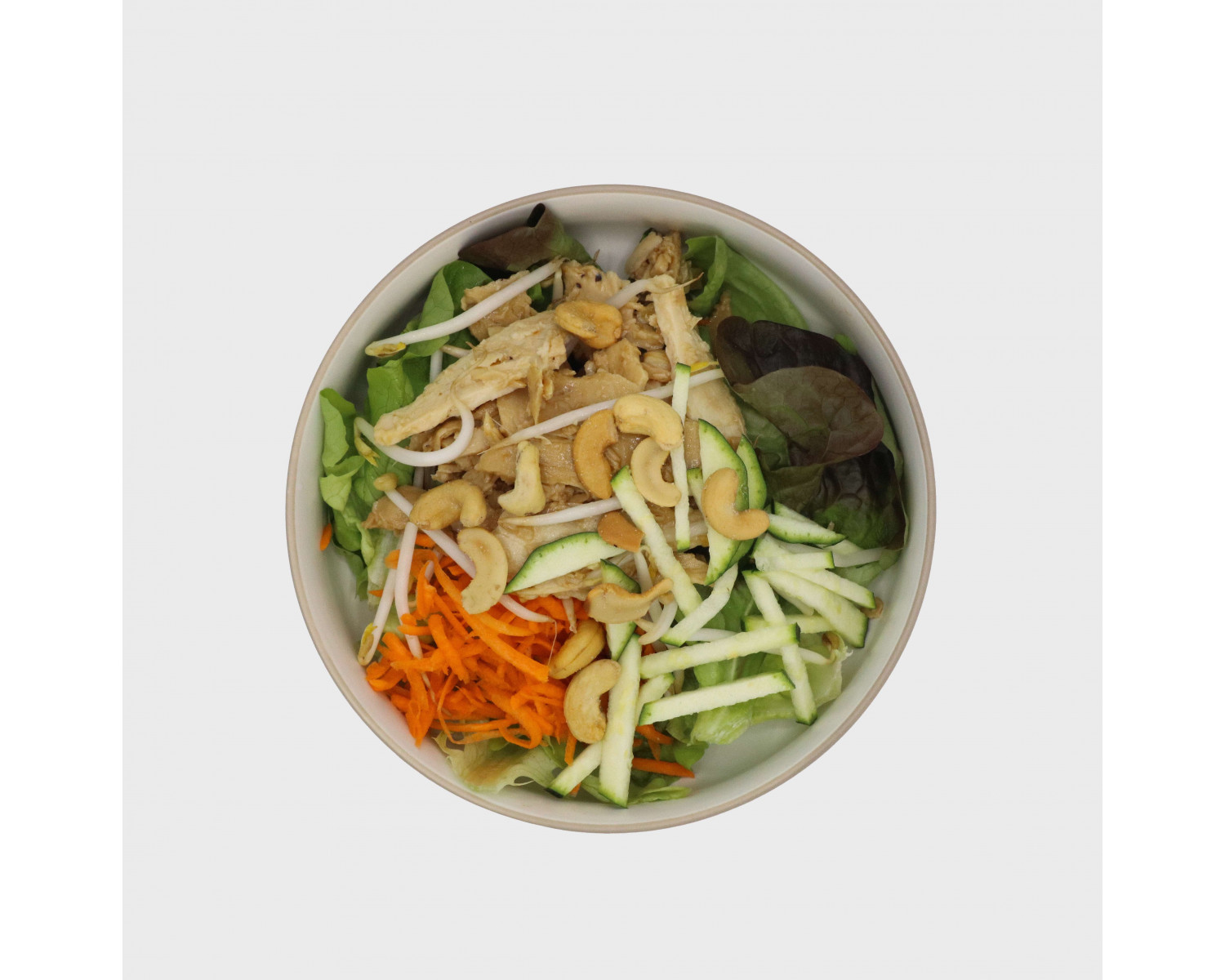 Mixed salad, strips of chicken marinated in soy sauce and sesam oil, grated carrots, strips of zucchini, soy sauce and cashew nuts. Balsamic Vinaigrette