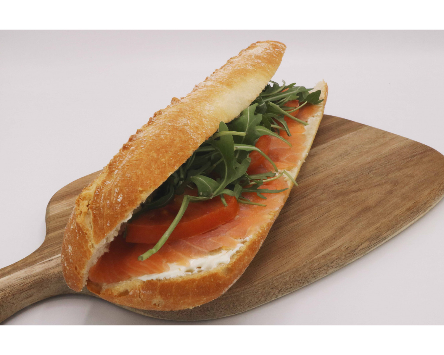 Smoked salmon, fresh cheese, eggplant caviar, tomatoes and arugula.