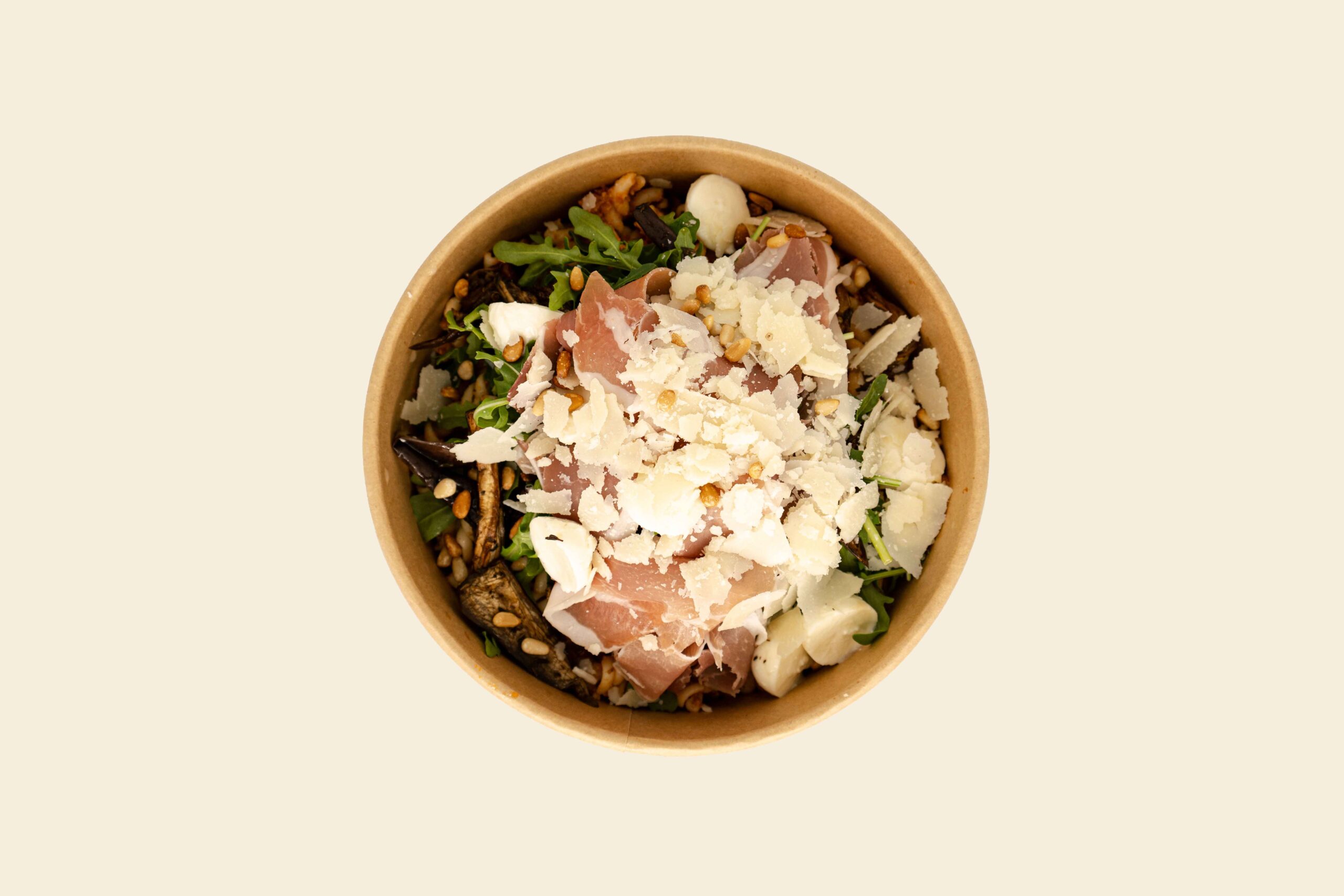 Pasta salad with tomato pesto, arugula, mini mozza balls, Italian ham, grilled eggplant and grilled pine nuts and parmesan shavings.