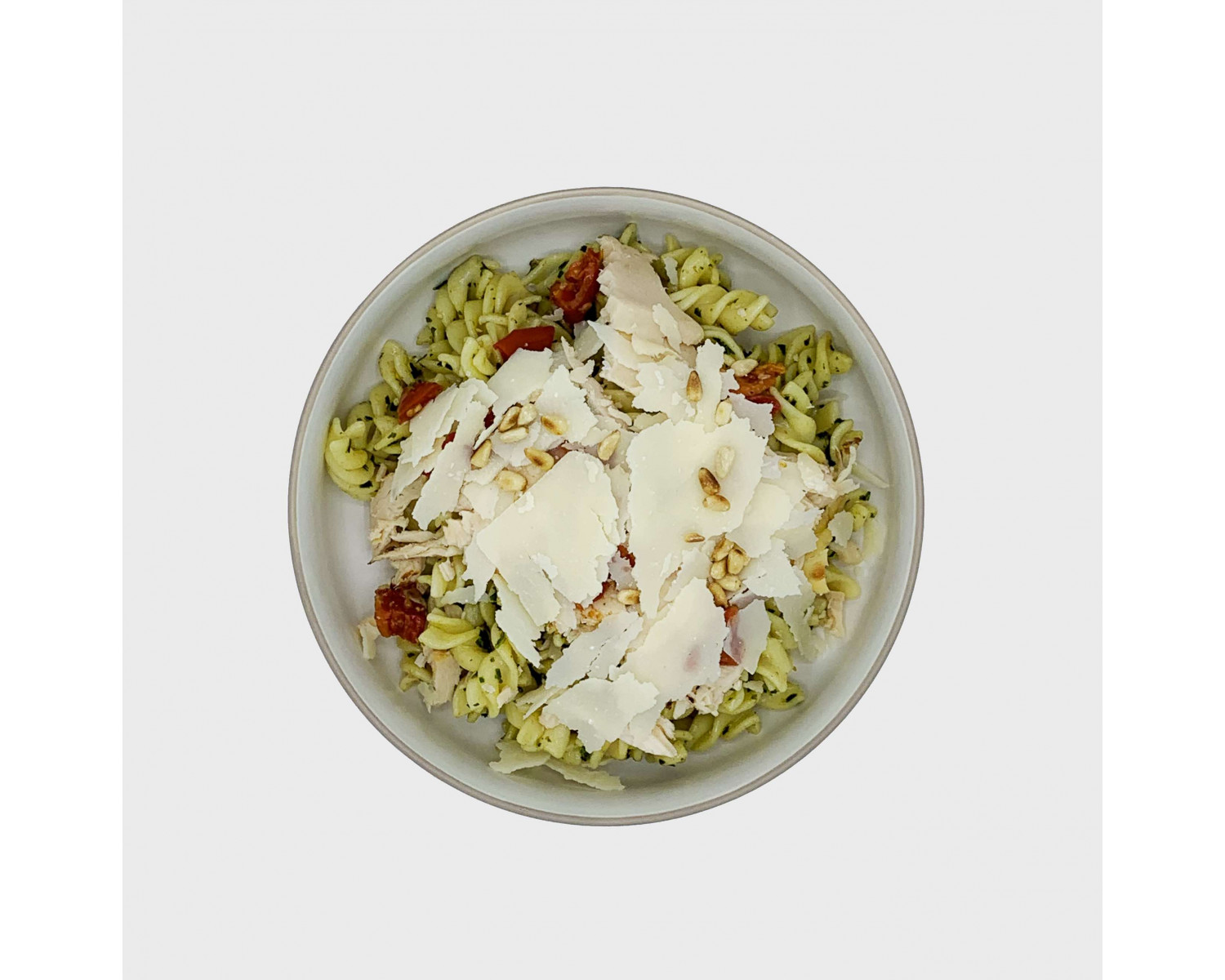 Pasta, green pesto, grilled pine nuts, strips of steamed chicken, dried tomatoes, parmesan shavings.